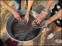 Rotglühend werden die Schalen aus dem Ofen zuerst in Sägemehl gelegt und abgedeckt, so entstehen die für Raku typischen Risse in der Glasur. Anschliessend waschen die Gäste Ihre Schalen in Wasser was die Farben wieder zum Leuchten bringt. Jede Schale ist ein einzigartiges und überraschendes Unikat, bei dem man vorab nicht so genau weiss wie das Ergebnis sein wird.